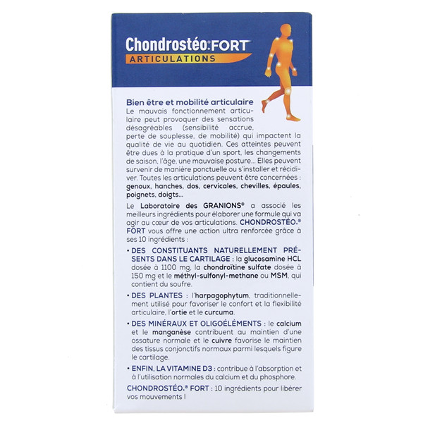 Le Laboratoire des GRANIONS a associé les meilleurs ingrédients pour élaborer une formule qui va agir au cœur de vos articulations. CHONDROSTÉO+ FORT vous offre une action ultra renforcée grâce à ses 10 ingrédients.