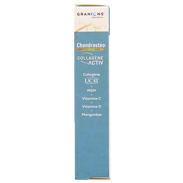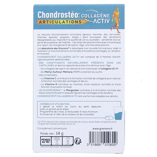 Chondrostéo Articulations Collagène Activ 30 Gélules, du laboratoire des Granions, est un complément alimentaire. Il permet d’assurer le fonctionnement normal des articulations, dont les cartilages, les os, les tendons et les muscles.