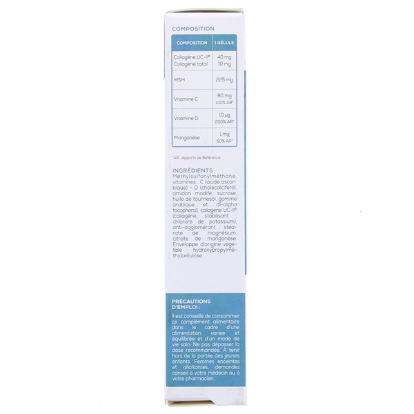 Méthylsulfonylméthane, Vitamines : C (Acide ascorbique), D (Cholécalciférol, Amidon modifié, Sucrose, Huile de tournesol, Gomme arabique et DL-alpha-tocophérol), Collagène UC-II® (Collagène, Stabilisant : Chlorure de potassium), Anti-agglomérant : Stéarate de magnésium, Citrate de manganèse. Enveloppe d’origine végétale : Hydroxypropylméthylcellulose