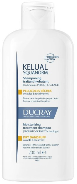 Kelual Squanorm Shampooing Pellicules Sèches des laboratoires dermatologiques Ducray est un shampooing traitant et hydratant qui élimine 100 % des pellicules visibles dès la 1ʳᵉ utilisation.