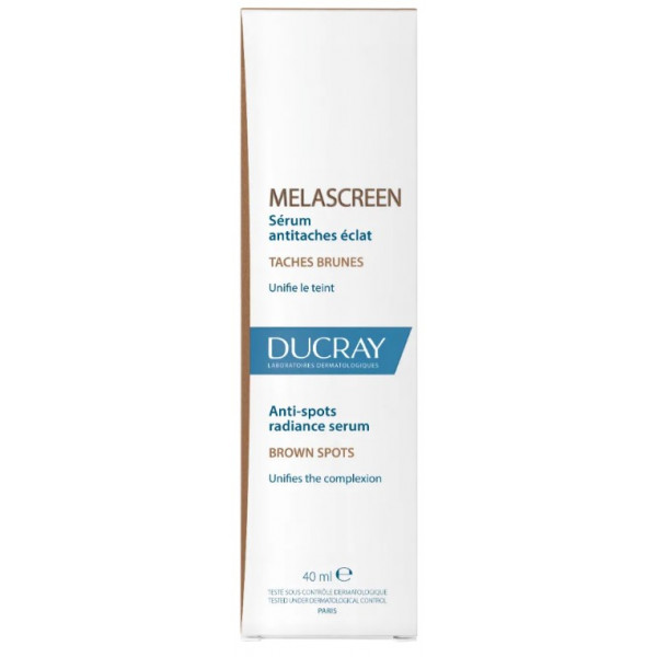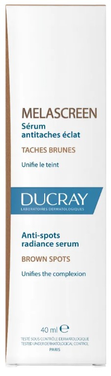 Melascreen Sérum antitaches éclat des laboratoires dermatologiques Ducray est indiqué pour unifier et illuminer le teint. Il s'utilise idéalement après le mois d'application du concentré antitaches Melascreen.
