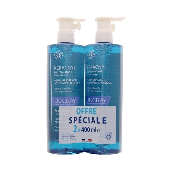Le gel moussant Keracnyl des laboratoires Ducray possède une formule à base lavante douce sans savon qui permet d'être adapté pour un nettoyage en profondeur des peaux grasses ou à tendance acnéique. Il convient au visage et au corps.
