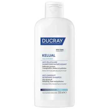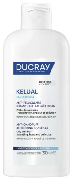 Kelual Squanorm Shampooing Rafraîchissant des laboratoires dermatologiques Ducray nettoie les cheveux et élimine efficacement les pellicules, tout en apportant une sensation de fraîcheur au cuir chevelu pour apaiser les inconforts.