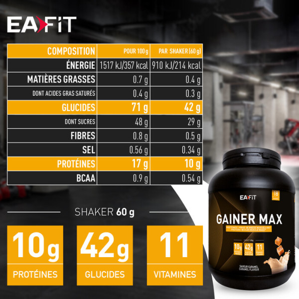 Eafit Gainer Max Caramel est un complément alimentaire destiné aux personnes désirant une prise de masse. Il a été formulé en laboratoire par les spécialistes en nutrition de la marque Eafit en collaboration avec des athlètes professionnels. Grâce à ses 217 kcal par portion, il permet d’atteindre facilement les objectifs caloriques quotidiens.