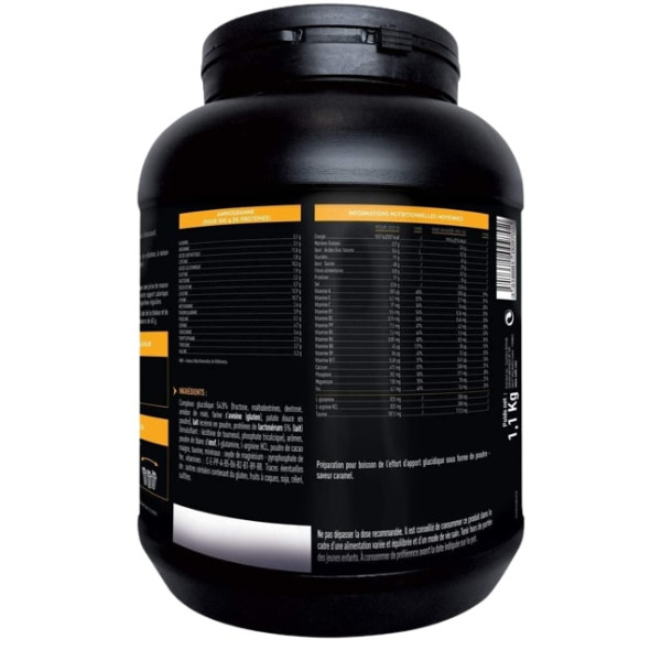 Complexe glucidique 54,8 % (fructose, maltodextrines, dextrose, amidon de maïs, farine d’avoine [gluten], patate douce en poudre), lait écrémé en poudre, protéines de lactosérum 5 % (lait) (émulsifiant : lécithine de tournesol, phosphate tricalcique), arômes, poudre de blanc d’œuf, L-glutamine, L-arginine HCL, taurine, minéraux : oxyde de magnésium - pyrophosphate de fer, vitamines : C-E-PP-A-B5-B6-B2-B1-B9-B8. Traces éventuelles d’autres céréales contenant du gluten, de fruits à coques, de soja, de cèleri, de sulfites et de lupin.