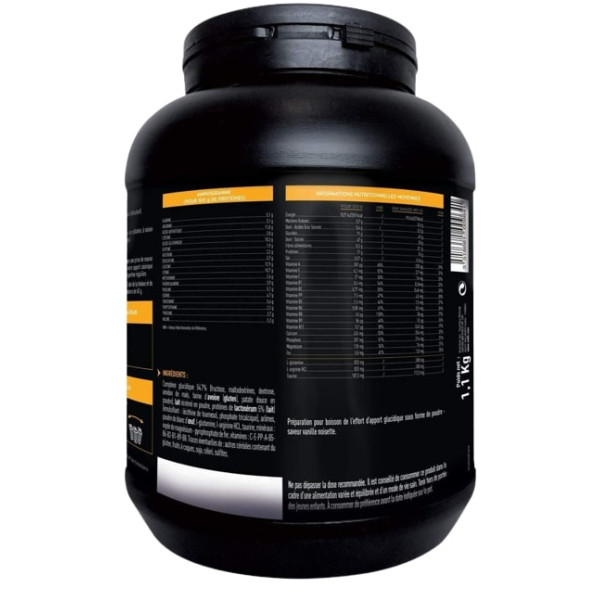 Complexe glucidique 54,8 % (fructose, dextrose, farine d’avoine, maltodextrines, poudre de patate douce) – lait écrémé en poudre – protéines de lactosérum 5 % (lait) – émulsifiant (phosphate tricalcique, lécithine de tournesol) – café soluble 2 % — arômes – poudre de blanc d’œuf – L-arginine HCL – L-glutamine – taurine – minéraux (oxyde de magnésium, pyrophosphate de fer) – vitamines C, E, PP, A – B1, B5, B6, B8, B9. Traces éventuelles de fruits à coques, cèleri, sulfites, soja, céréales contenant du gluten.