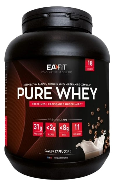 Pure Whey Cappuccino est un complément conçu par Eafit, une marque française leader en nutrition sportive. Elle fabrique des produits formulés en laboratoire par des spécialistes en alimentation. Ses supplémentations sont testées et approuvées par des athlètes professionnels. Grâce à des recherches minutieusement menées et à la sélection de matières premières, la marque propose des compléments performants, de haute qualité et bien tolérés tout en étant respectueux de l’organisme.