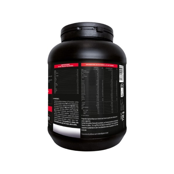 Concentrat de protéines de lactosérum (lait) 65,92 % (émulsifiant : lécithines tournesol/soja, anti-agglomérant : phosphate tricalcique), isolat de protéines de lactosérum (lait) 25 % (lécithines tournesol/soja), café soluble 3 %, arômes (lait) (anti-agglomérant : silice [nano], acidifiant : acide lactique), arôme naturel (triglycérides d’acide gras, stabilisant : gomme arabique), épaississant : gomme xanthane, L-glutamine, L-arginine (soja), oxyde de magnésium, taurine, agent de charge : maltodextrine, édulcorant : acésulfame de potassium, complexe enzymatique (alpha amylase, protéase, lactase, lipase, cellulase), vitamine C, édulcorant : sucralose, pyrophosphate de fer, vitamines : E-B3-A (amidon de maïs, épaississant : gomme arabique, antioxydant : alpha tocophérol) — B5-B6-B2-B12-B1-B9-B8. Traces possibles de céréales contenant du gluten, d’œufs, de fruits à coque, de cèleri et de sulfites.