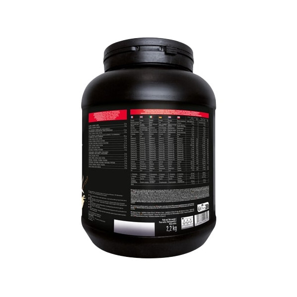 Concentrat de protéines de lactosérum 42,7% (émulsifiants : lécithine de tournesol, phosphate tricalcique) (lait), isolat de protéines de lactosérum 41% (émulsifiant : lécithine de tournesol) (lait), hydrolysat de protéines de lactosérum 10% (lait), arômes (antiagglomérant : E551 [nano], stabilisant : gomme arabique), épaississant : gomme xanthane, l-glutamine, l-arginine, minéraux : oxyde de magnésium - pyrophosphate de fer, édulcorants : acésulfame de potassium - sucralose, taurine, vitamines : C-E-PP-A (antioxydant : dl-alpha-tocophérol)-B5- B6-B2-B1-B12-B9-B8, complexe enzymatique (alpha amylase - protéase - lactase - lipase - cellulase), maltodextrines.