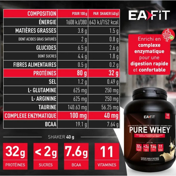 Ce produit est dénué de colorant artificiel et de conservateur bien qu’il contient des édulcorants. De saveur Vanille Intense, Pure Whey est conditionné en pot de 750 g, renfermant 18 shakers de 40 g chacun.