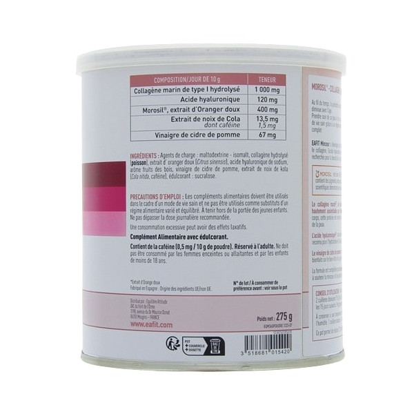 Agents de charge : maltodextrine - isomalt, collagène hydrolysé (poisson), extrait d'oranger doux (Citrus sinensis), acide hyaluronique de sodium, arôme fruits des bois, vinaigre de cidre de pomme, édulcorant : sucralose, extrait de noix de kola (Cola nitida). Ne pas dépasser la dose journalière indiquée. À tenir hors de portée des enfants. Ce complément alimentaire ne peut se substituer à une alimentation variée, équilibrée et à un mode de vie sain.