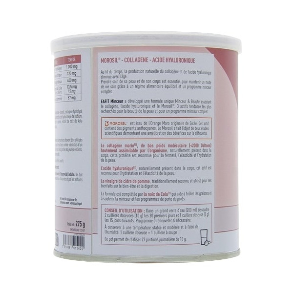 Eafit a développé une formule unique Minceur & Beauté dans son complément alimentaire Minceur 360, associant le collagène marin, l'acide hyaluronique et le Morosil, 3 actifs tendance les plus recherchés pour la beauté et la peau.