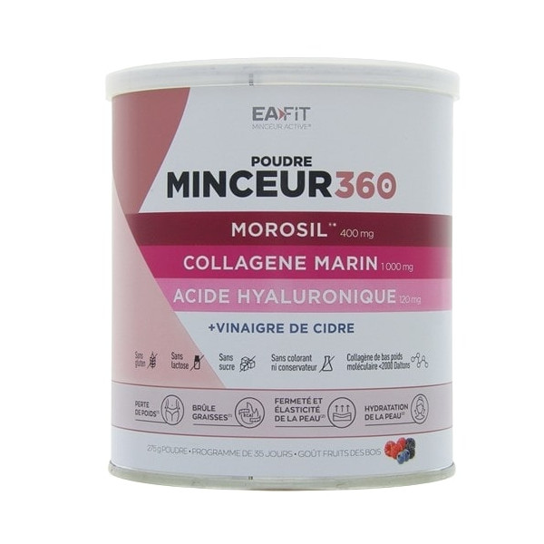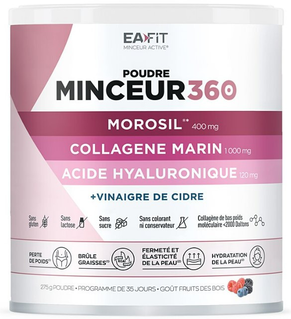 La poudre Minceur 360 Eafit est un programme minceur complet formulé à base de Morosil, Collagène Marin, Acide Hyaluronique et Vinaigre de Cidre. Minceur 360 est indiqué pour contribuer à la perte de poids, brûler les graisses et raffermir la peau tout en favorisant son hydratation.