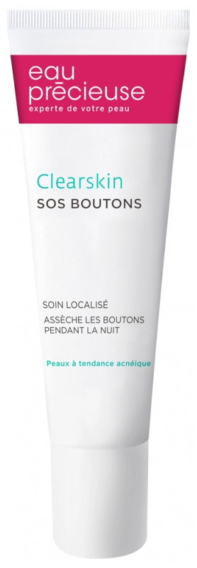 Pour prendre soin des peaux à tendance acnéique, la marque Eau Précieuse a fabriqué le SOS Boutons Clearskin. Ce soin se présente sous forme de crème et est conditionné dans un tube de 10 ml. Sa formulation riche et hautement concentrée permet d’éliminer les imperfections ainsi que les impuretés sur le visage. Son usage réduit également les boutons de façon très efficiente en agissant pendant la nuit, de sorte qu’au réveil tout bouton soit supprimé.
