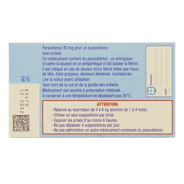- Enfant de 4 à 6 kg (environ 2 à 4 mois) : 1 sachet ou 1 suppositoire à 80 mg, 4 fois par jour ;