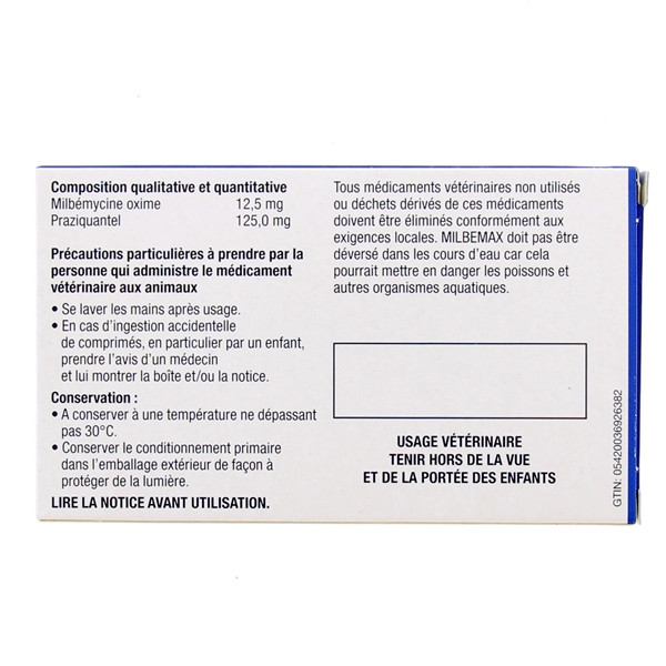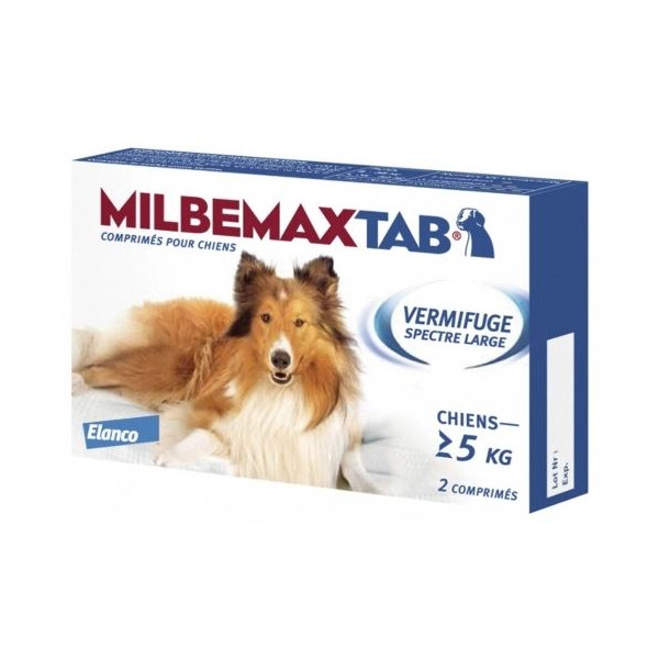 MilbemaxTab est un vermifuge à large spectre. Il agit aussi bien sur les versronds que les vers plats. MilbemaxTab est recommandé pour les chiens de plus de 5 kg.