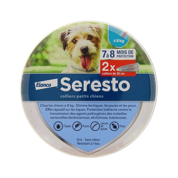Seresto Collier pour petits chiens jusqu'à 8 kg est indiqué pour éliminer et repousser efficacement les tiques, les puces et les poux. Ce collier antiparasitaires est sans odeur et résiste à l'eau.
