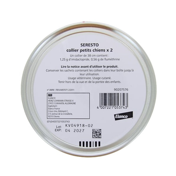Le Collier petit Chiens Seresto est composé de matériaux de qualité. Il intègre une formule antiparasitaire avancée qui élimine les tiques, les puces et les poux tout en restant inodore. Le collier est résistant à l’eau et assure une protection de longue durée.
