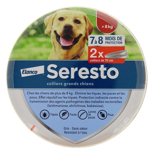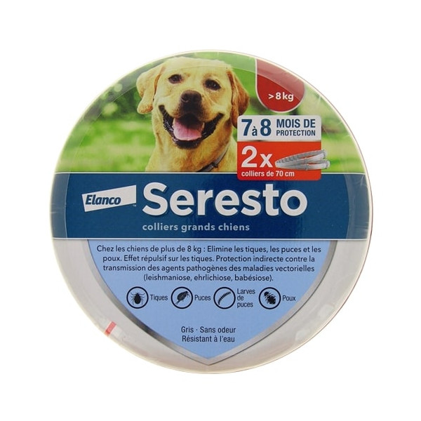 Le collier antiparasitaire Seresto est tout indiqué pour assurer le bien-être des chiens de plus de 8 kg. Il offre une protection efficace contre les parasites tels que les puces, les tiques et les poux.