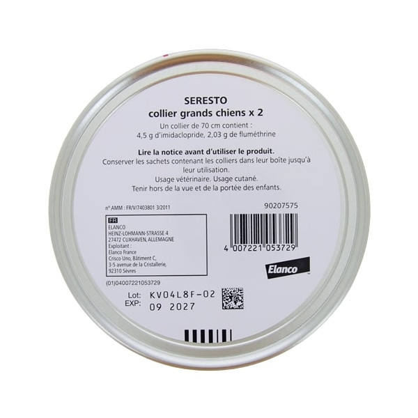 Seresto Collier pour grands chiens de plus de 8 kg est indiqué pour éliminer et repousser de manière efficace les tiques, les puces et les poux. Ce collier antiparasitaires est sans odeur et résistant à l'eau.