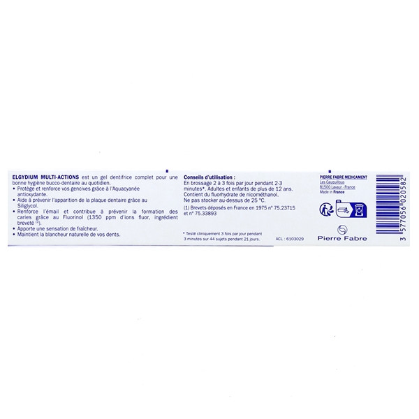 Le gel dentifrice Multi-Actions Elgydium représente une solution tout-en-un pour une hygiène bucco-dentaire optimale. En l’occurrence, il agit sur plusieurs aspects : plaque dentaire, protection contre les caries, soin des gencives et fraîcheur de l'haleine. Sa formule se destine surtout aux adultes et aux adolescents de plus de 12 ans.