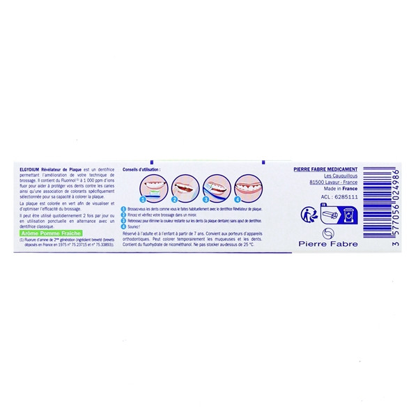 Indication : dentifrice révélateur plaque dentaire et anticaries. Pour adultes, adolescents et enfants dès 7 ans. S’adapte au port d’appareil orthodontique.