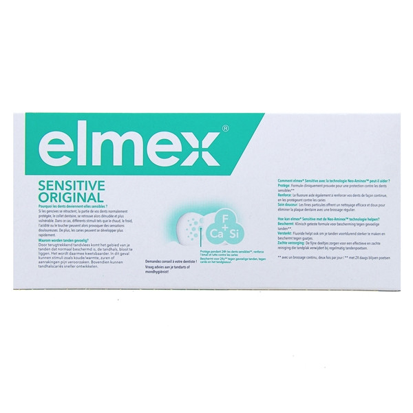 Sensitive Original Dentifrice 2x75ml de la marque Elmex a été spécialement élaboré pour protéger au quotidien les dents sensibles. Elle offre aux personnes affectées par ce type de pathologie dentaire une triple action à l’efficacité cliniquement prouvée.