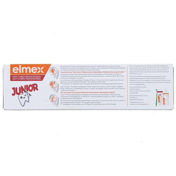 Elmex Professional Dentifrice Anti-Caries Junior est le premier dentifrice dédié aux enfants qui comporte la technologie brevetée « Neutraliseur d’acides de sucre ». Ce principe actif inhibe directement les méfaits des acides de sucre issus de la plaque dentaire et qui sont à l’origine de l'apparition de caries. La combinaison de cet ingrédient avec du fluorure (1450 ppm de monofluorophosphate de sodium) et du calcium s’avère particulièrement efficace pour reminéraliser et renforcer les dents. Grâce à sa texture unique, ce produit d’hygiène dentaire se diffuse aisément entre les dents des enfants. Son utilisation convient aux porteurs d’appareil et de bagues orthodontiques. Ce dentifrice aromatisé à la menthe est disponible en tube de 75ml.