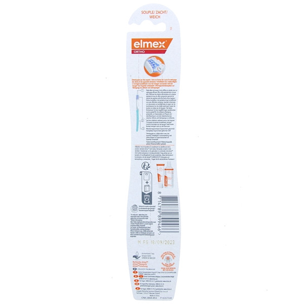 La brosse à dents Elmex Ortho peut être orientée pour offrir un angle de brossage optimal. Son manche ergonomique de cette brosse à dents offre une prise en main confortable, même lorsqu'il est mouillé. Elle est disponible en blister d'une unité avec une couleur envoyée aléatoirement.