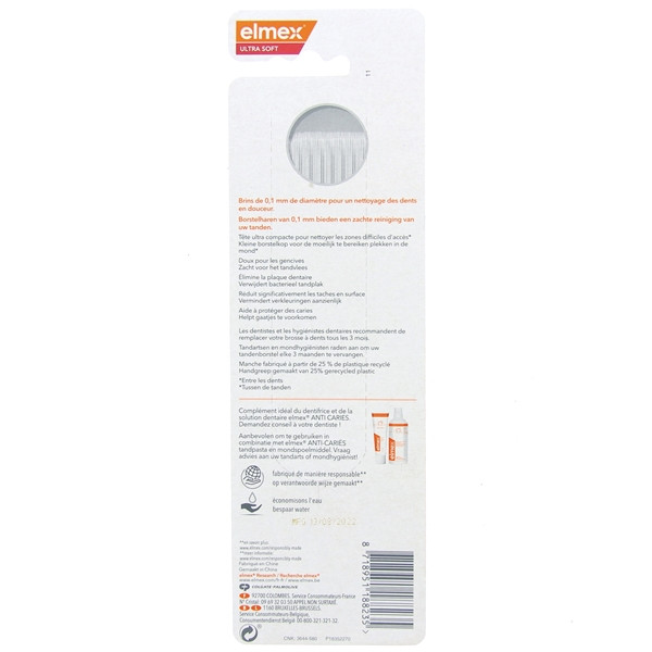 La brosse à dents Elmex Ultra Soft est adaptée pour la prophylaxie de la carie chez l'adulte. Sa tête compacte facilite le brossage dans les zones difficiles d'accès. Grâce à ses poils extra souple, cette brosse à dent limite les saignement des gencives.