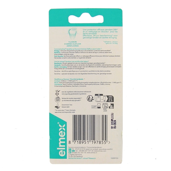 Formulé à l’Olafluor, le dentifrice Elmex se fixe instantanément sur l'émail des dents sensibles, dans le but de lutter efficacement contre les effets acides des bactéries au niveau de la plaque dentaire.