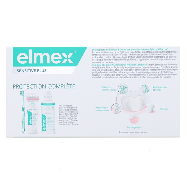 Le dentifrice Sensitive Plus Protection Complète de la marque Elmex offre une action complète et ciblée sur la sensibilité. Ce dentifrice complet aide à protéger les dents contre la sensibilité ainsi que les caries, l'affaiblissement de l'émail, le tartre et l'irritation des gencives.