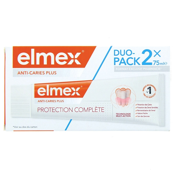 Anti-caries Plus Dentifrice Protection Complète 2x75ml de la marque Elmex offre une protection performante contre l’affaiblissement de l’émail et la formation de caries. Son utilisation au quotidien permet de profiter d’une parfaite hygiène bucco-dentaire et d’avoir une bouche saine.