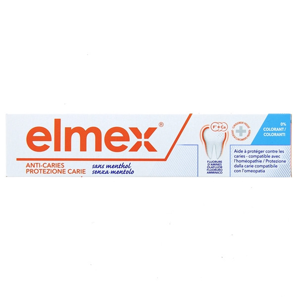 Anti-caries Sans Menthol Dentifrice 75ml Elmex a été conçu pour reminéraliser les dents et les protéger contre la formation de caries. Il a été spécifiquement créé pour les patients sous traitement homéopathique et qui doivent ainsi éviter l’utilisation de produits aromatisés. Ce dentifrice s’adresse aussi aux personnes allergiques au menthol.