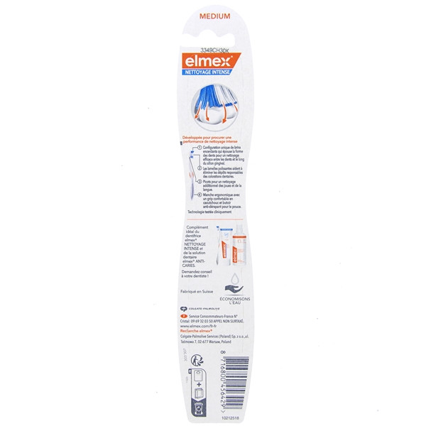 - Brosse à dents Elmex NETTOYAGE INTENSE destiné à un brossage régulier, quotidiennement.