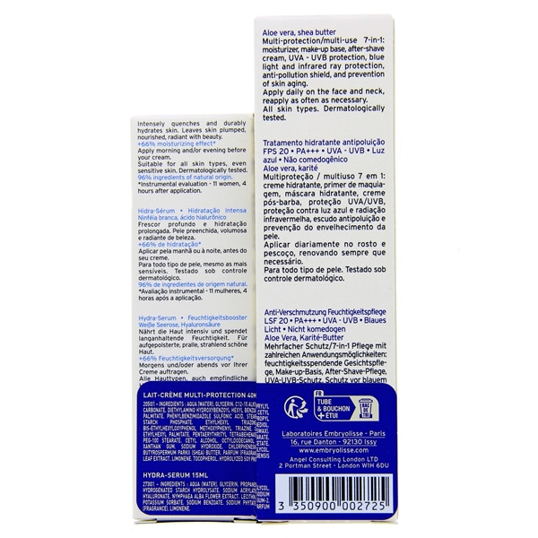 Découvrez l'offre d'Embryolisse : un Lait-crème Multi-protection SPF20 40 ml + un Hydra-sérum 15 ml offert. Ce duo est idéal pour hydrater et protéger efficacement votre peau du visage.