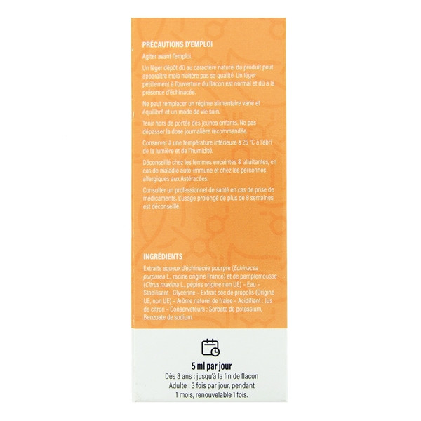 Extrait aqueux d'échinacée pourpre bio (Echinacea purpurea L, racine), Extrait aqueux de pamplemousse bio (Citrus maxima L, pépins), Eau, Stabilisant : Glycérine, Extrait sec de propolis bio, Arôme naturel, Acidifiant : jus de citron bio, Conservateurs : Sorbate de potassium, Benzoate de sodium.