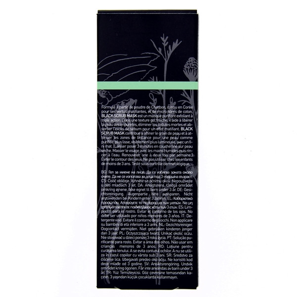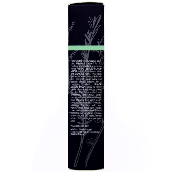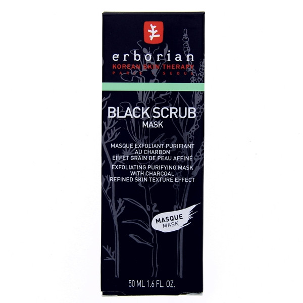 Erborian Mask Black Scrub a été élaboré selon une formule unique associant tradition coréenne et modernité française. Ce masque comporte de la poudre de charbon réputée pour ses pouvoirs matifiants et des microfibres de coton qui possèdent des vertus exfoliantes douces. Un complexe d’herbes aux propriétés apaisantes, hydratantes et antioxydantes s’ajoute à ces principaux ingrédients. Pour parfaire la composition, Erborian a inclus des extraits de racine, de feuilles et de fleurs de plantes connues pour leurs bienfaits sur la peau du visage, comme le thé vert, la camomille, la réglisse, le romarin... Ce masque à la texture gel fraîche se révèle particulièrement efficace pour éliminer les impuretés et les cellules mortes. Il absorbe également l’excès de sébum pour atténuer les zones de brillance et apporter un fini mat.