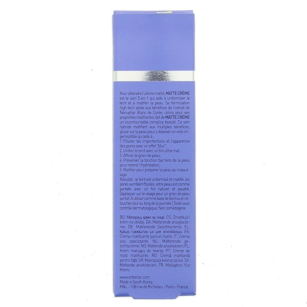 Ce soin matifiant visage effet floutée "Matte Crème" d'Erborian est destinée aux personnes recherchant à matifier leur teint. Matte Crème convient à tous les types de peaux : mixtes, grasses ou sèches.