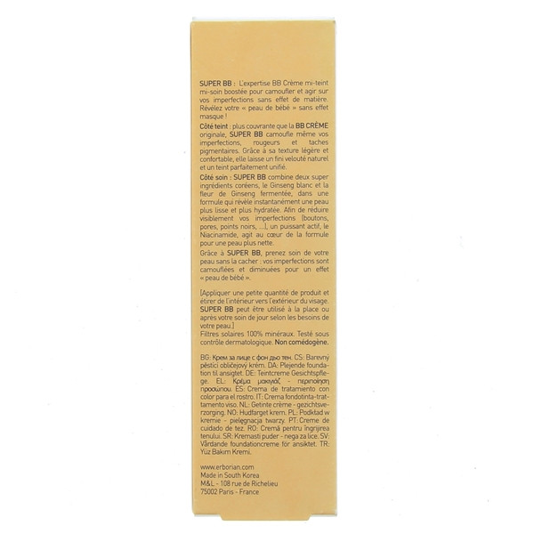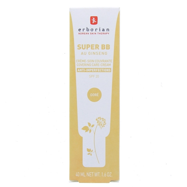 Super BB Doré de la marque Erborian est une crème-soin couvrante anti-imperfection avec une protection SPF 20. Ce soin permet de camoufler les imperfections, d'apporter une hydratation et d'unifier le teint.