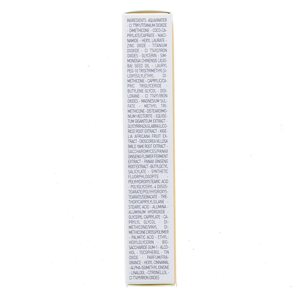 AQUA/WATER -CI 77891/TITANIUM DIOXIDE -DIMETHICONE -COCO-CAPRYLATE/CAPRATE -HEXYL LAURATE -NIACINAMIDE -ZINC OXIDE –TITANIUM DIOXIDE-GLYCERIN -SIMMONDSIA CHINENSIS (JOJOBA) SEED OIL -LAURYL PEG-10 TRIS(TRIMETHYLSILOXY)SILYLETHYL DIMETHICONE -CAPRYLIC/CAPRIC TRIGLYCERIDE -BUTYLENE GLYCOL -SYNTHETIC FLUORPHLOGOPITE -DISILOXANE -CI 77492/IRON OXIDES -METHYL TRIMETHICONE -MAGNESIUMSULFATE -DISTEARDIMONIUM HECTORITE -EQUISETUM GIGANTEUM EXTRACT -DIOSCOREA VILLOSA (WILD YAM) ROOT EXTRACT -GLYCYRRHIZA GLABRA (LICORICE) ROOT EXTRACT -KIGELIA AFRICANA FRUIT EXTRACT -SACCHAROMYCES/PANAX GINSENG FLOWER FERMENT EXTRACT -PANAX GINSENG ROOT EXTRACT -BUTYLOCTYL SALICYLATE -POLYHYDROXYSTEARICACID -POLYGLYCERYL-4 DIISOSTEARATE/POLYHYDROXYSTEARATE/SEBACATE -TRIETHOXYCAPRYLYLSILANE -ALUMINA -STEARIC ACID -ALUMINUM HYDROXIDE -GLYCERYL CAPRYLATE -CAPRYLYL GLYCOL -PALMITIC ACID -DIMETHICONE/VINYL DIMETHICONE CROSSPOLYMER -ETHYLHEXYLGLYCERIN -BIOSACCHARIDE GUM-1 -ALCOHOL -TOCOPHEROL -TIN OXIDE -PARFUM/FRAGRANCE -HEXYL CINNAMAL -ALPHA-ISOMETHYL IONONE -LINALOOL -CITRONELLOL -CI 77491/IRON OXIDES -CI 77499/IRON OXIDES