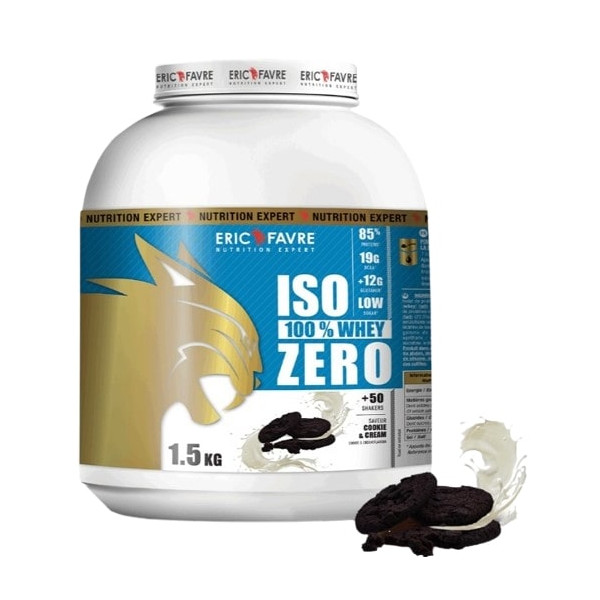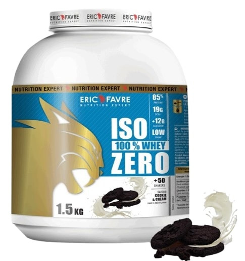 Iso Zero Cookies & Cream de la marque Eric Favre est indiqué pour favoriser le développement musculaire. Cette préparation est constituée de plus de 83 % de protéines de whey (WPI, WPC), l'une des plus pures sources de protéines.