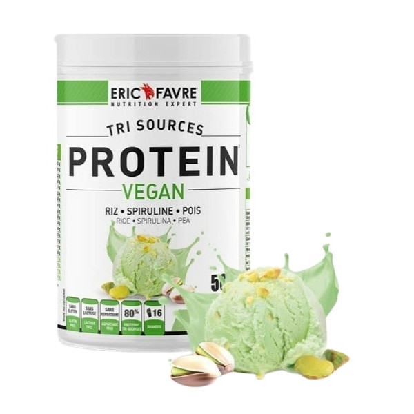 Protein Vegan Pistache de la marque Eric Favre est issu de 3 sources de protéines : le pois, le riz et la spiruline titrée en chlorophylle. Elle est recommandée dans le cadre d'un programme d'entretien musculaire ou pour toutes les personnes qui ne consomment pas assez de protéines ou qui ont un besoin important en protéines.