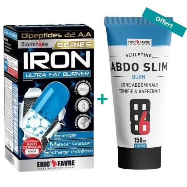 Offre Iron Ultra Fat Burner en flacon de 120 gélules + Gel Abdo Slim en tube de 150 ml offert de la marque Eric Favre. Ce duo se complète et est idéale pour brûler les graisses, affiner la silhouette tout en la tonifiant et la raffermissant.