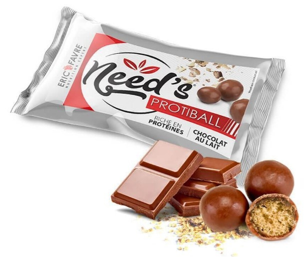 Need's Protiball de la marque Eric Favre est un snacking protéiné au chocolat au lait. Il peut se prendre après une séance de sport, après une longue journée ou entre les repas, en collation.