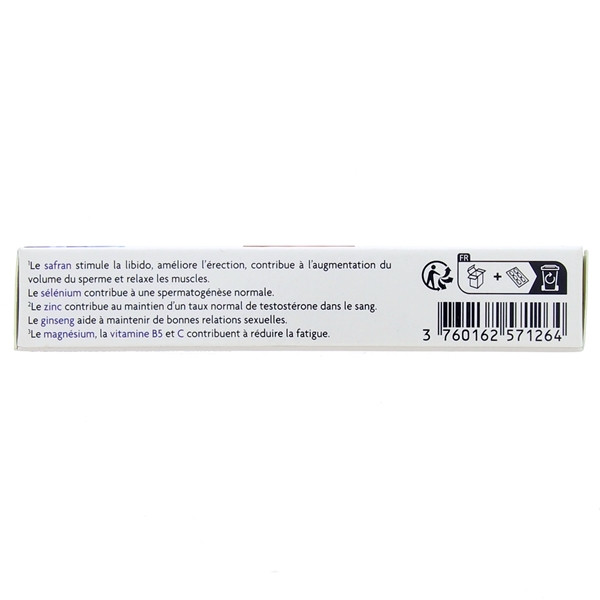 L-arginine, extrait de damiane, oxyde de magnésium, antiagglomérants : stéarate de magnésium, extrait de ginseng, extrait de safran, sulfate de zinc, vitamines : C et B5, extrait de tribule terrestre, extrait de guarana, extrait de piment de Cayenne, extrait de poivre noir, sélénite de sodium, gélule