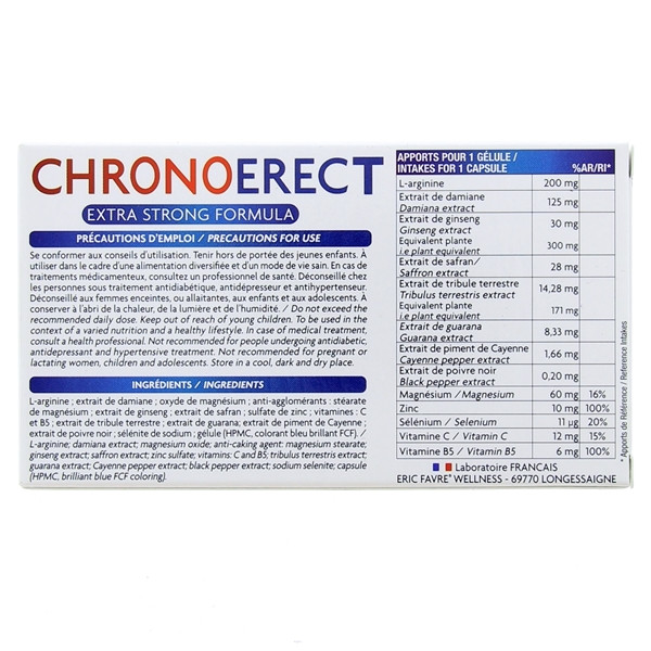 Chronoerect est un complément alimentaire stimulant 3 en 1 du laboratoire Eric Favre. Il est indiqué pour stimuler la libido, améliorer l'érection et augmenter le volume du sperme.