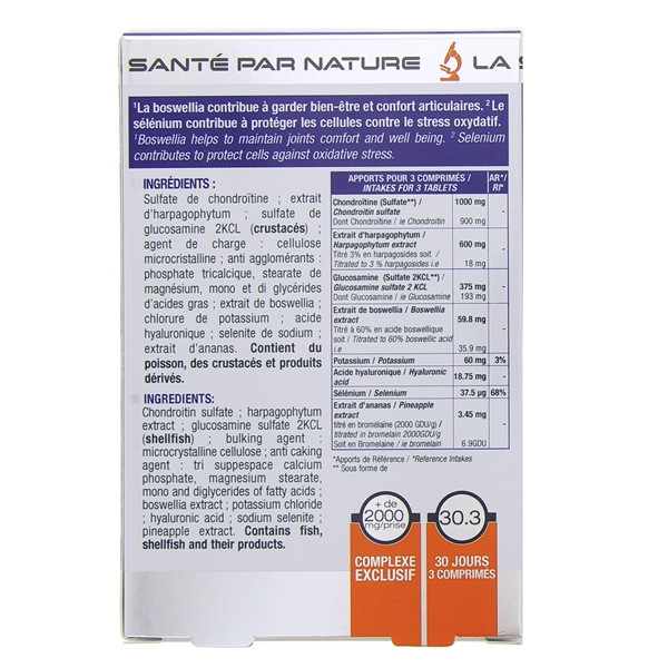 Sulfate de Chondroïtine (35?175 %), Extrait d’Harpagophytum titré à 3 % d’Harpagosides, D-Glucosamide Sulfate, 2KCL, Agent de Charge : Cellulose Microcristalline, Extrait de Boswellia titré à 65 % d’Acide Boswellique, Anti-agglomérants : Stéarate de Magnésium et Silice [Nano], Chlorure de Potassium, Acide Hyaluronique, Sélénite de Sodium, Extrait d’Ananas titré à 1200 GDU/g en Bromélaine.