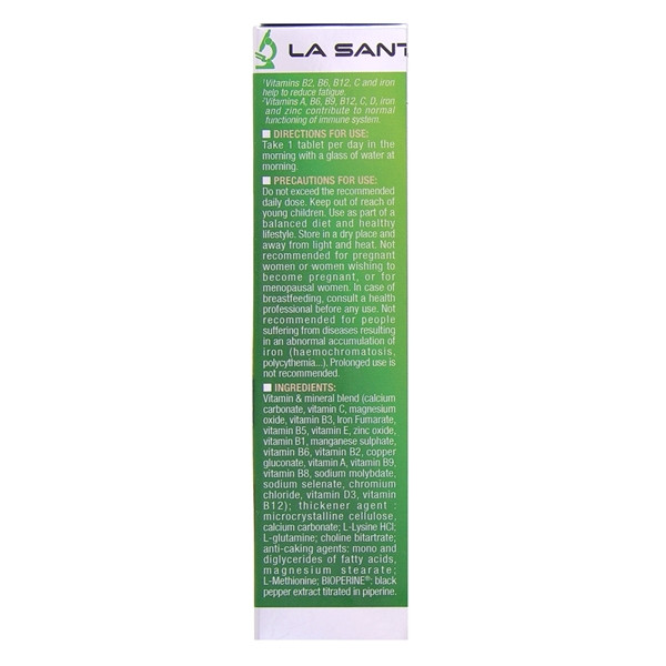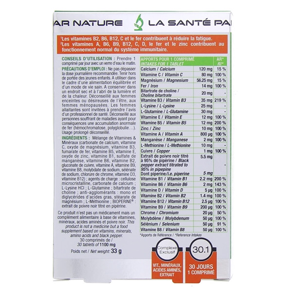 Mélanges de vitamines & Minéraux (carbonate de calcium, vitamine C, oxyde de magnésium, vitamine B3, fumarate de fer, vitamine B5, vitamine E, oxyde de zinc, vitamine B1, sulfate de manganèse, vitamine B6, vitamine B2, gluconate de cuivre, vitamine A, vitamine B9, vitamine B8, molybdate de sodium, sélénate de sodium, chlorure de chrome, vitamine D3, vitamine B12) ; agent de charge : cellulose microcristalline, carbonate de calcium, L-Lysine HCI, L-glutamine, bitartrate de choline, anti-agglomérants : mono et diglycérides d’acides gras, stéarate de magnésium, L-Méthionine, Bioperine : extrait de poivre noir titré en pipérine.