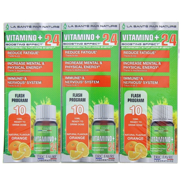 Vitamino+ 24 du laboratoire Eric Favre est un programme flash pour un effet coup de fouet à base de 24 vitamines. Ce complément alimentaire permet de réduire la fatigue, d'augmenter l'énergie mentale et physique et de soutenir le système immunitaire et nerveux.